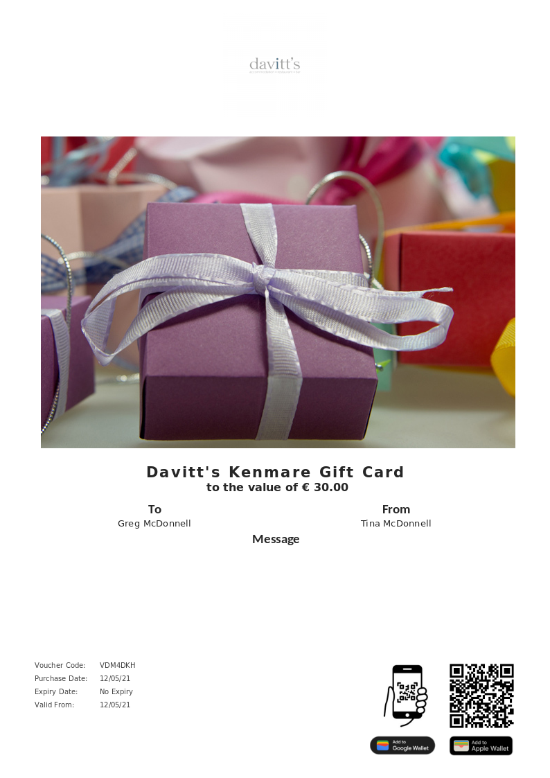 Davitt's Kenmare allows you to purchase instantly printable gift vouchers, special offers and tickets using the Voucher Connect platform.
